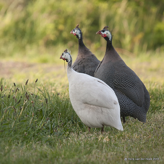 Er liepen een stuk of 8 van die parelhoenders waaronder enkele witte exemplaren. In vroeger jaren heb ik ze zelf ook gehouden maar dan alleen de natuurlijke kleur.