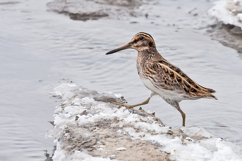 En dan als ik de foto's naast elkaar leg van een eerdere zekere watersnip dan is deze toch veel kleiner, snavel ook. En bij het wegvliegen was er geen snippengeluid. Ook de bestreping is anders.
