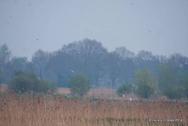 Een kolonie kokmeeuwen vliegt opeens op: