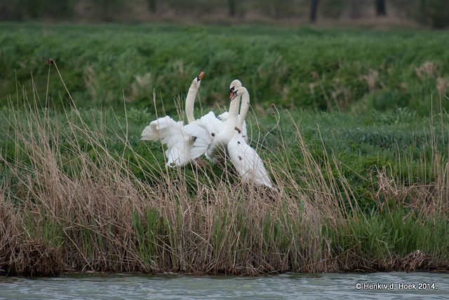 Knobbelzwanen: Wie gaat het met de prijs vandoor? (Het vrouwtje is de prijs.) Wel een beetje veraf maar misschien wel leuk om te zien. In april van dit jaar gezien.